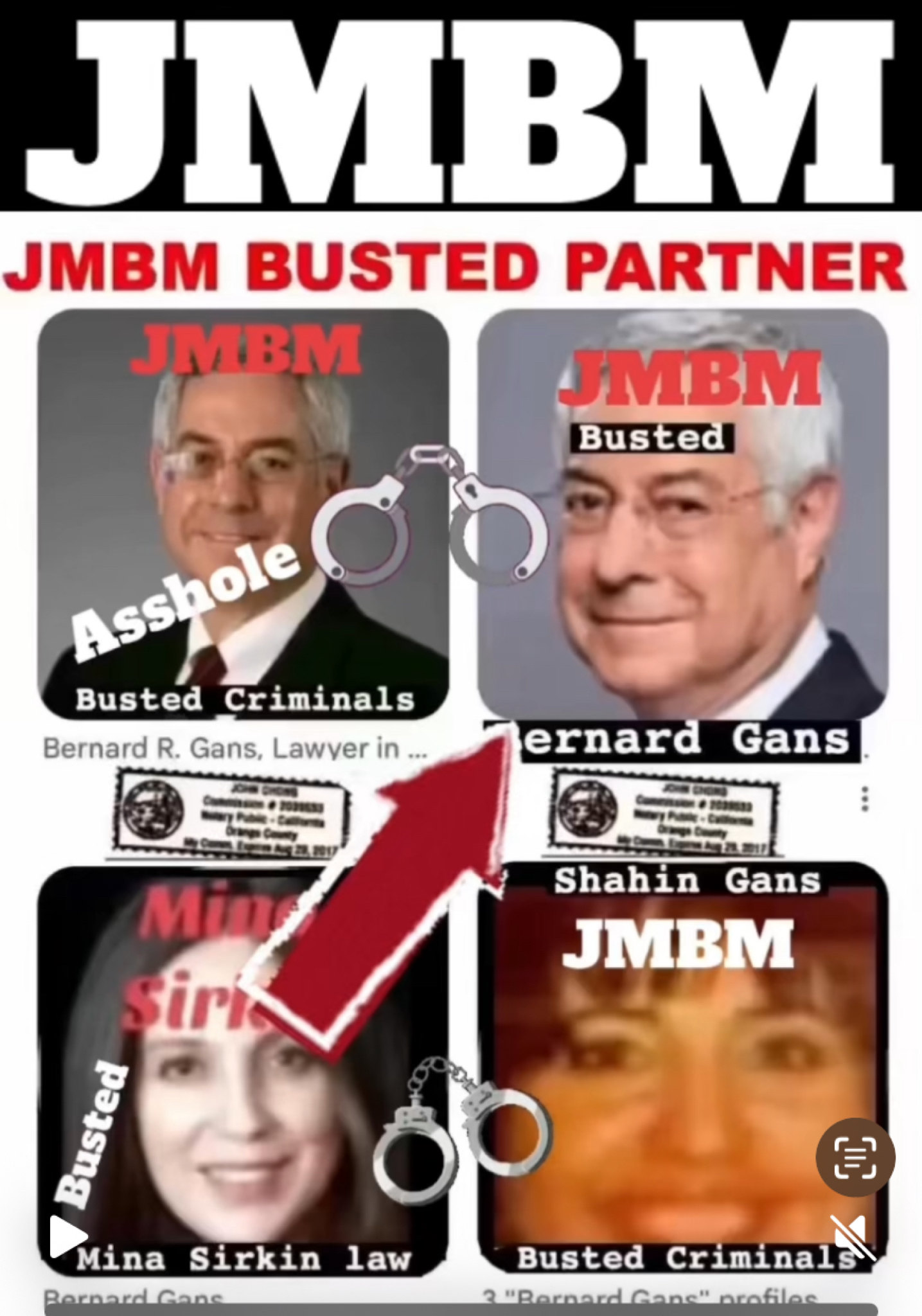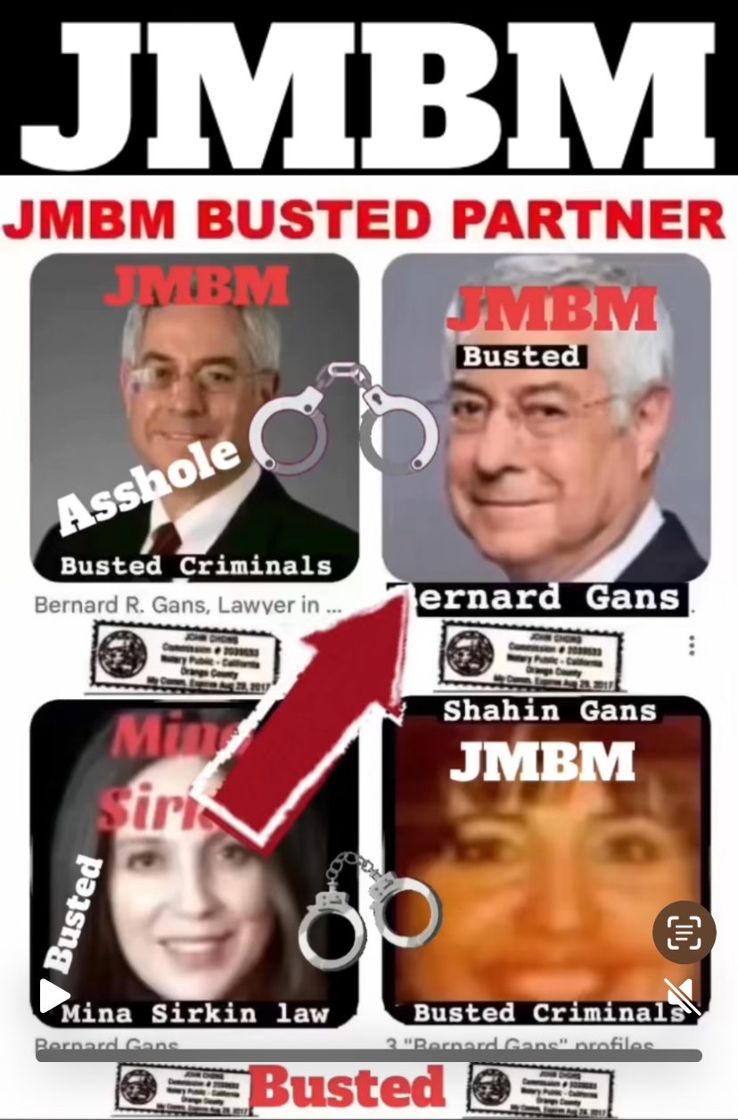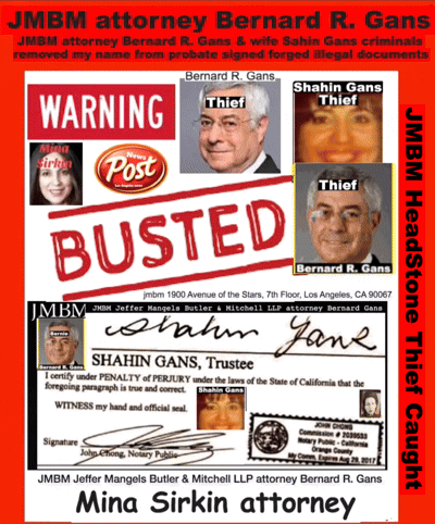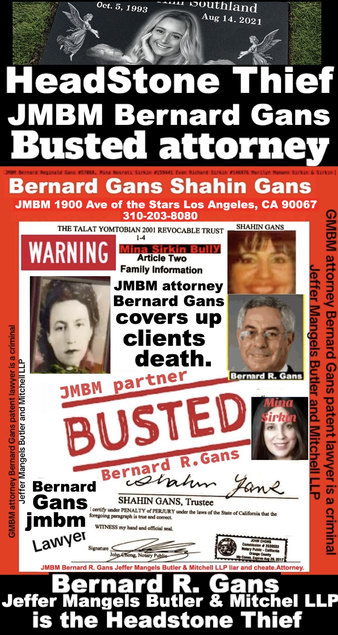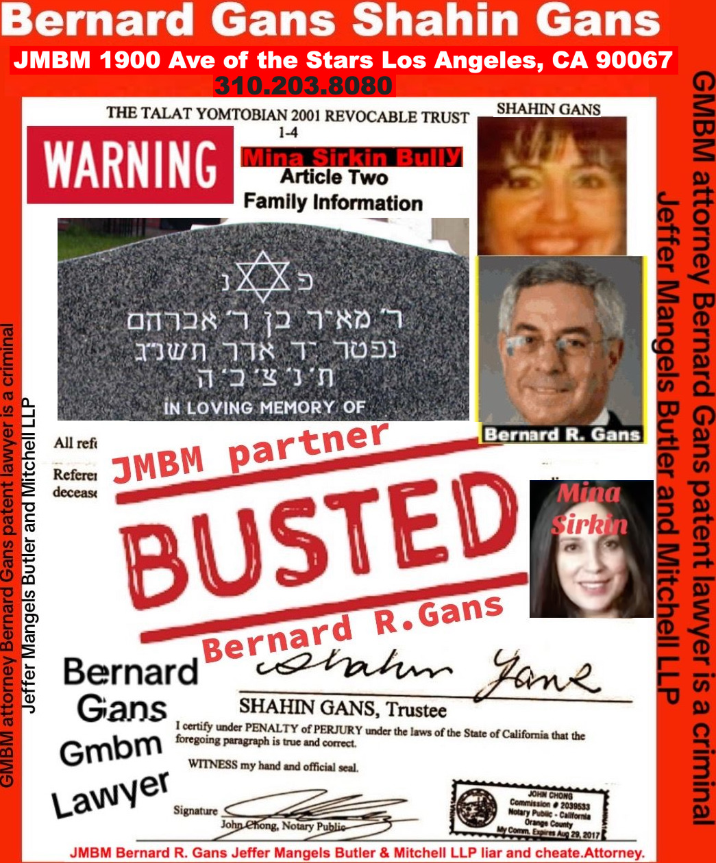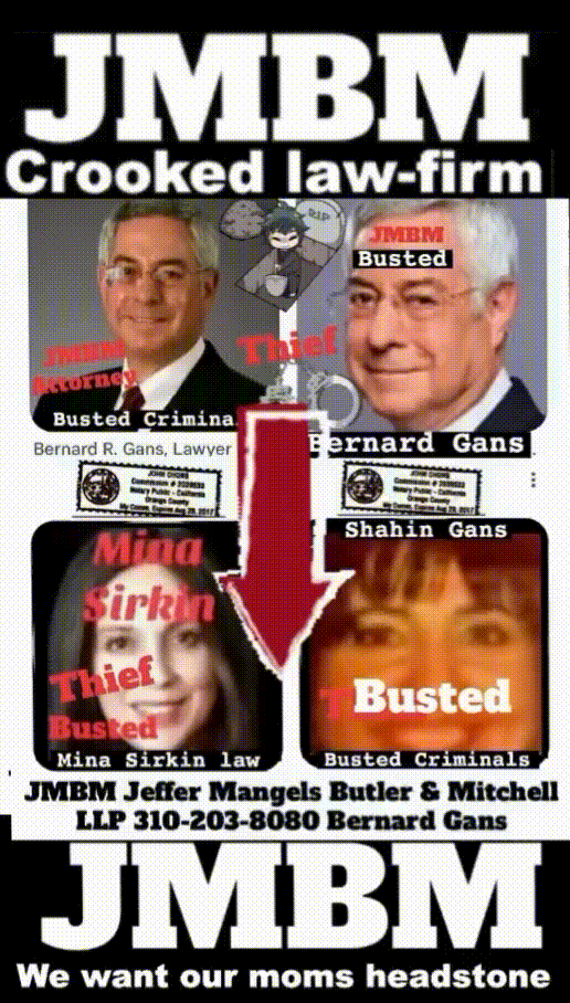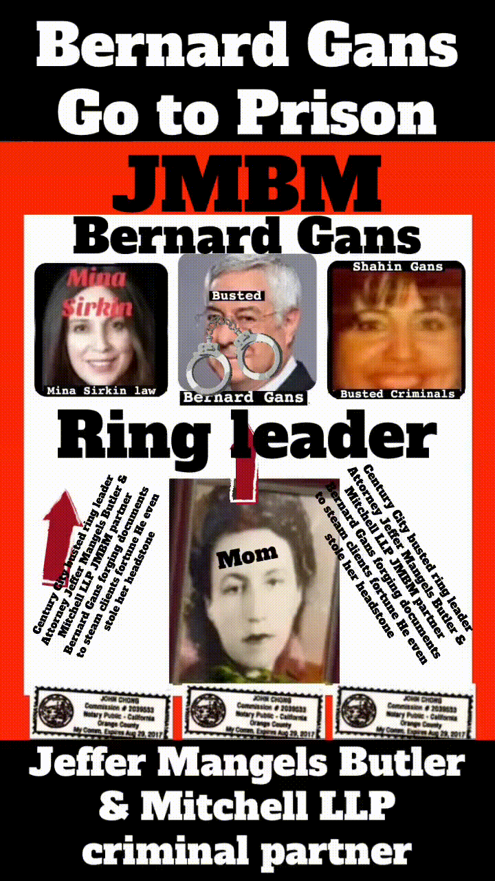 Suing JMBM partner $500,000,000,000.00 Busted criminal attorneys Jeffer Mangels Butler & Mitchell LLP lawyer Bernard Reginald Gans #57068 Bernard Gans Mina Sirkin law group JMBM killed my mom to get her fortune. Suing JMBM partner $500,000,000,000.00 Busted criminal attorneys Jeffer Mangels Butler & Mitchell LLP lawyer Bernard Reginald Gans #57068 Bernard Gans Mina Sirkin law group JMBM killed my mom to get her fortune..