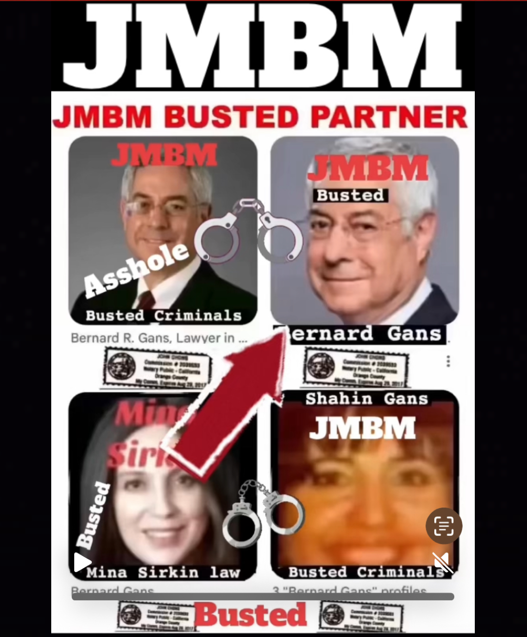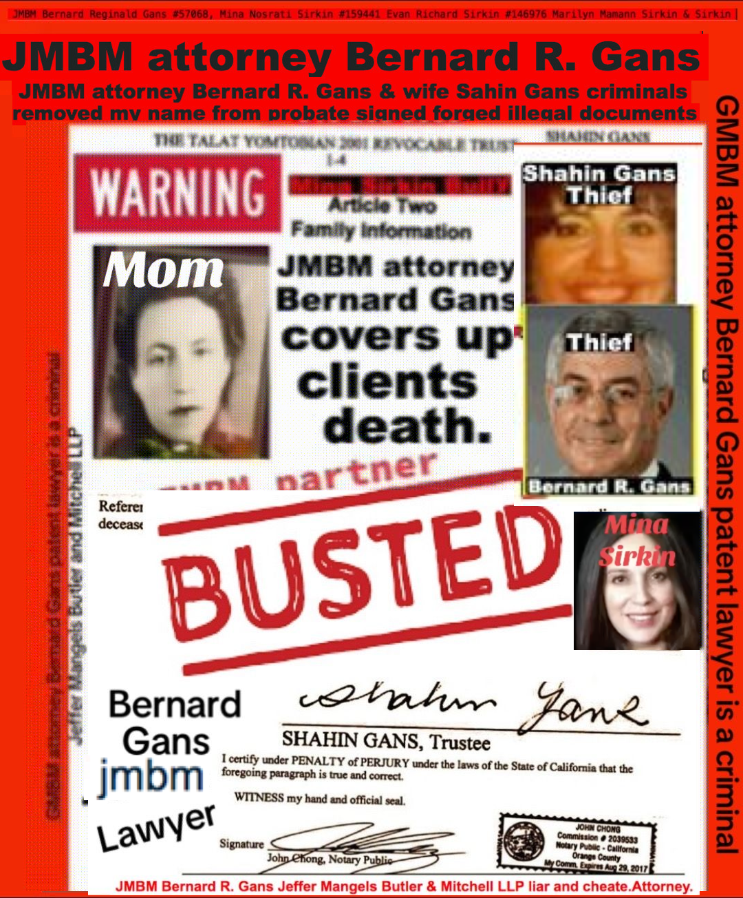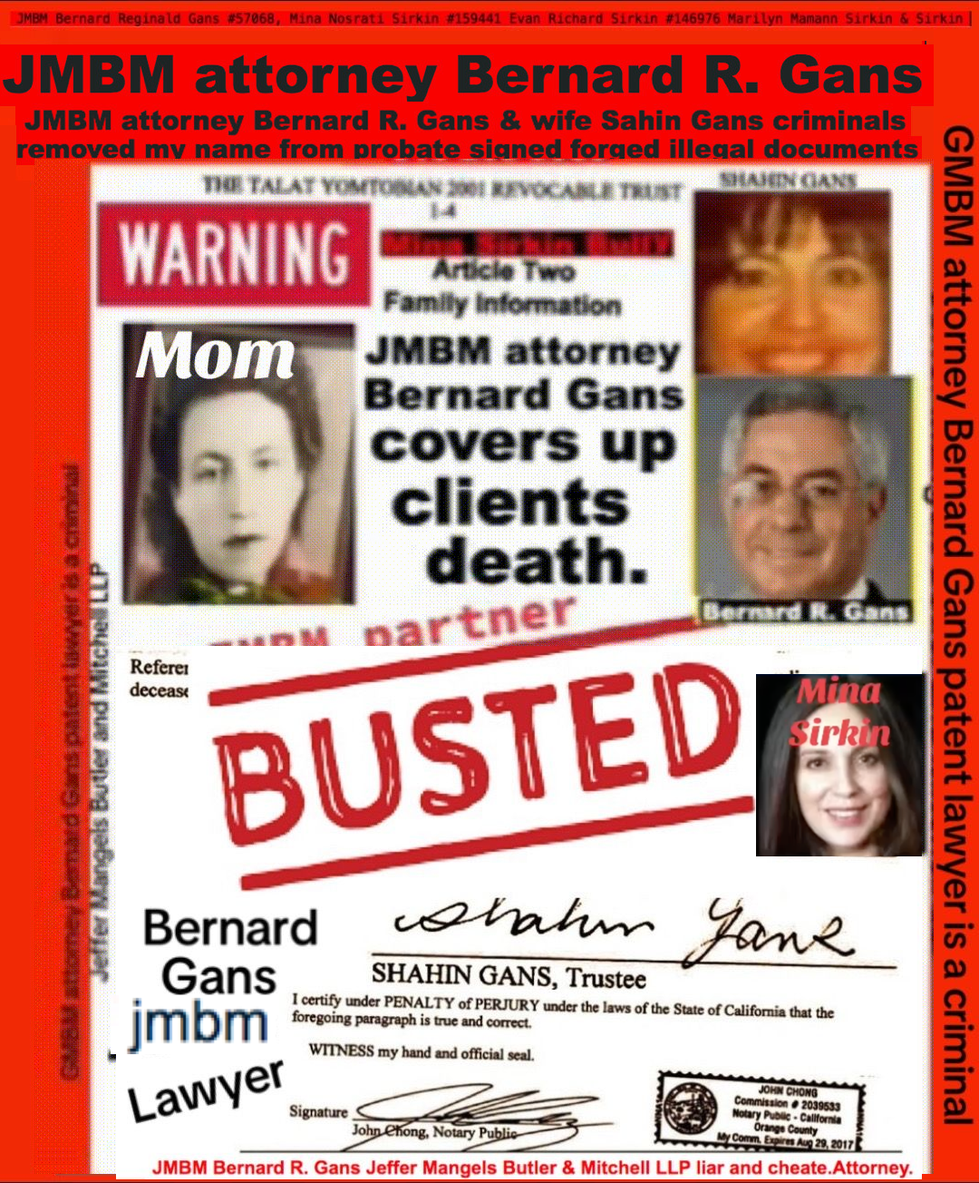 Busted criminal attorneys Jeffer Mangels Butler & Mitchell LLP lawyer Bernard Reginald Gans #57068 Bernard Gans Mina Sirkin law group JMBM killed my mom to get her fortune.