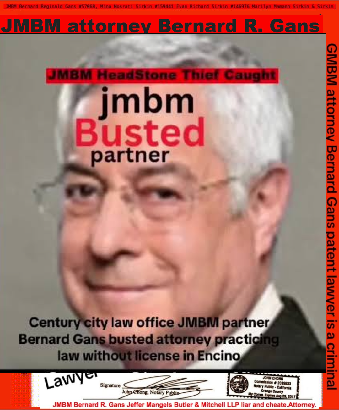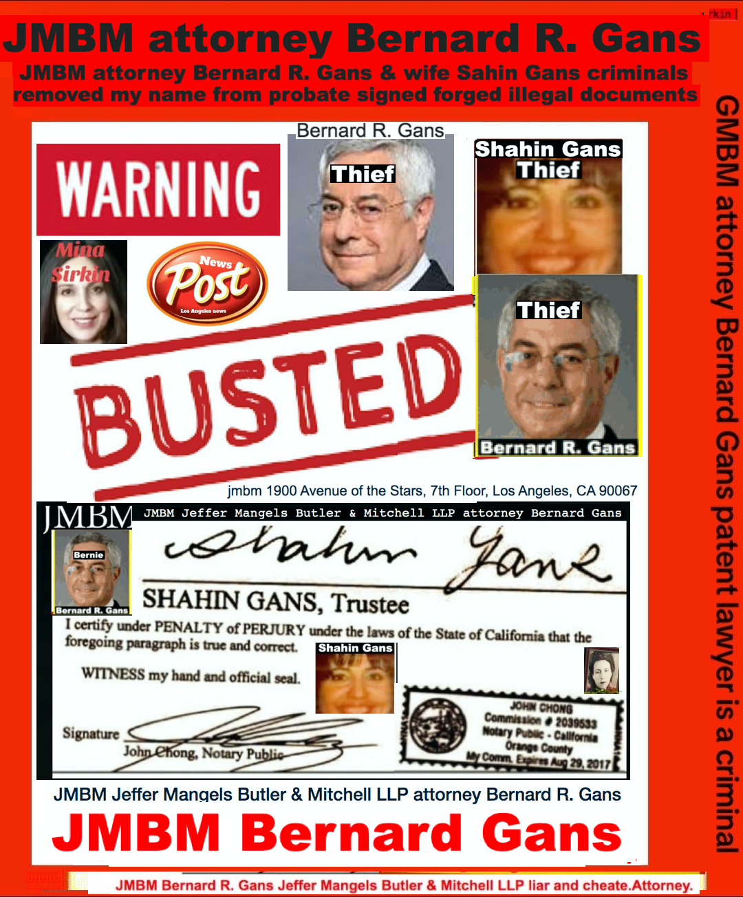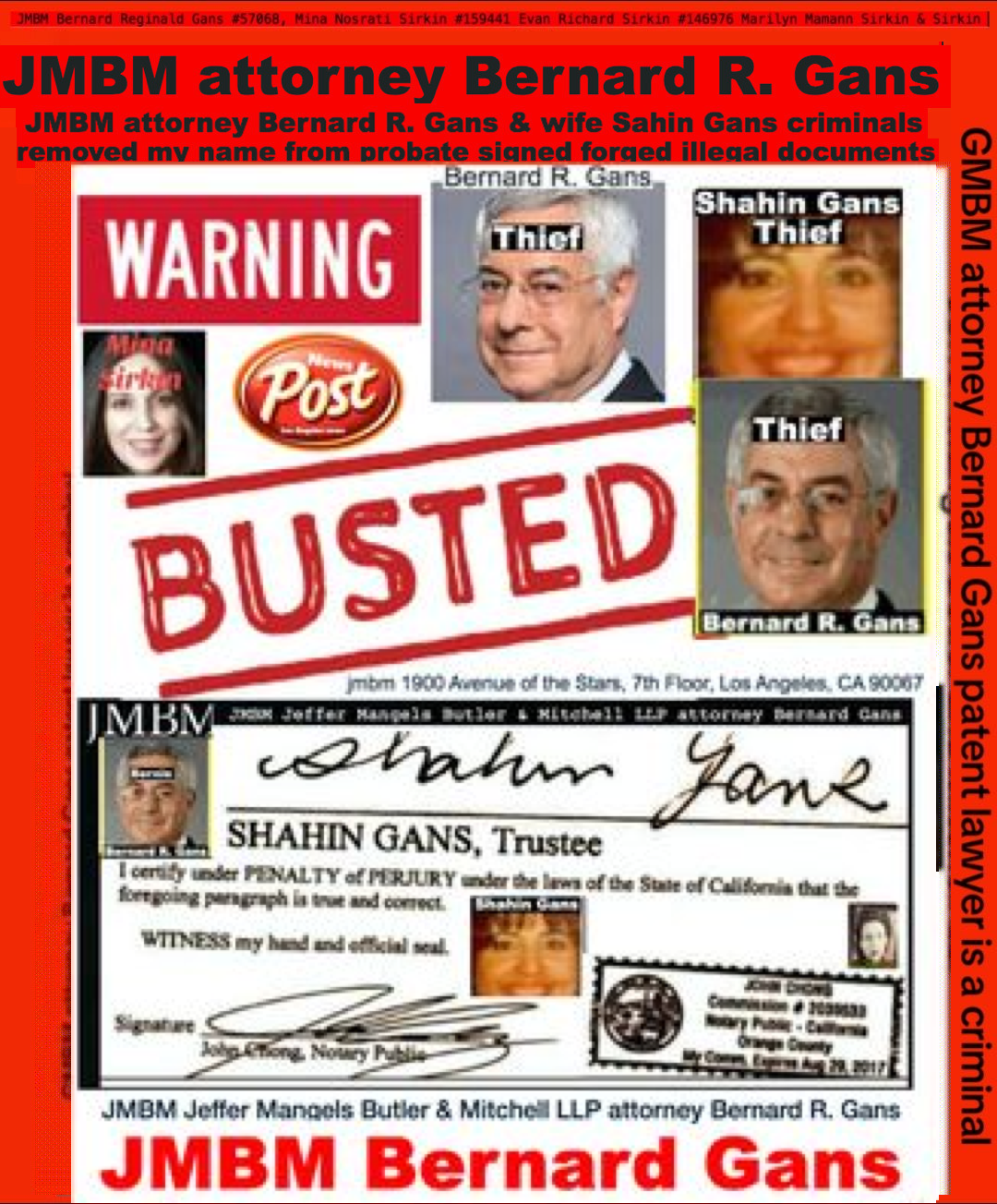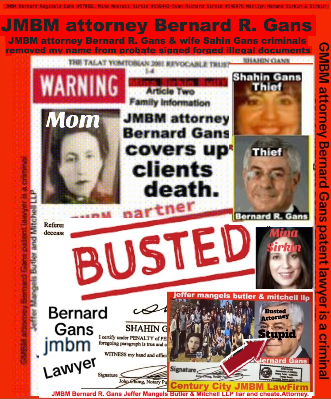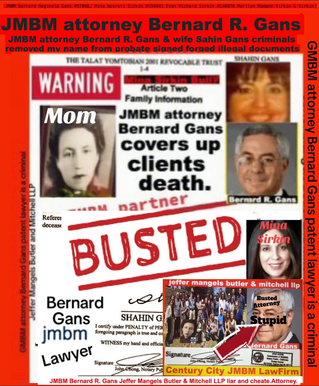 Suing JMBM partner $500,000,000,000.00 Busted criminal attorneys Jeffer Mangels Butler & Mitchell LLP lawyer Bernard Reginald Gans #57068 Bernard Gans Mina Sirkin law group JMBM killed my mom to get her fortune.Suing JMBM partner $500,000,000,000.00 Busted criminal attorneys Jeffer Mangels Butler & Mitchell LLP lawyer Bernard Reginald Gans #57068 Bernard Gans Mina Sirkin law group JMBM killed my mom to get her fortune.