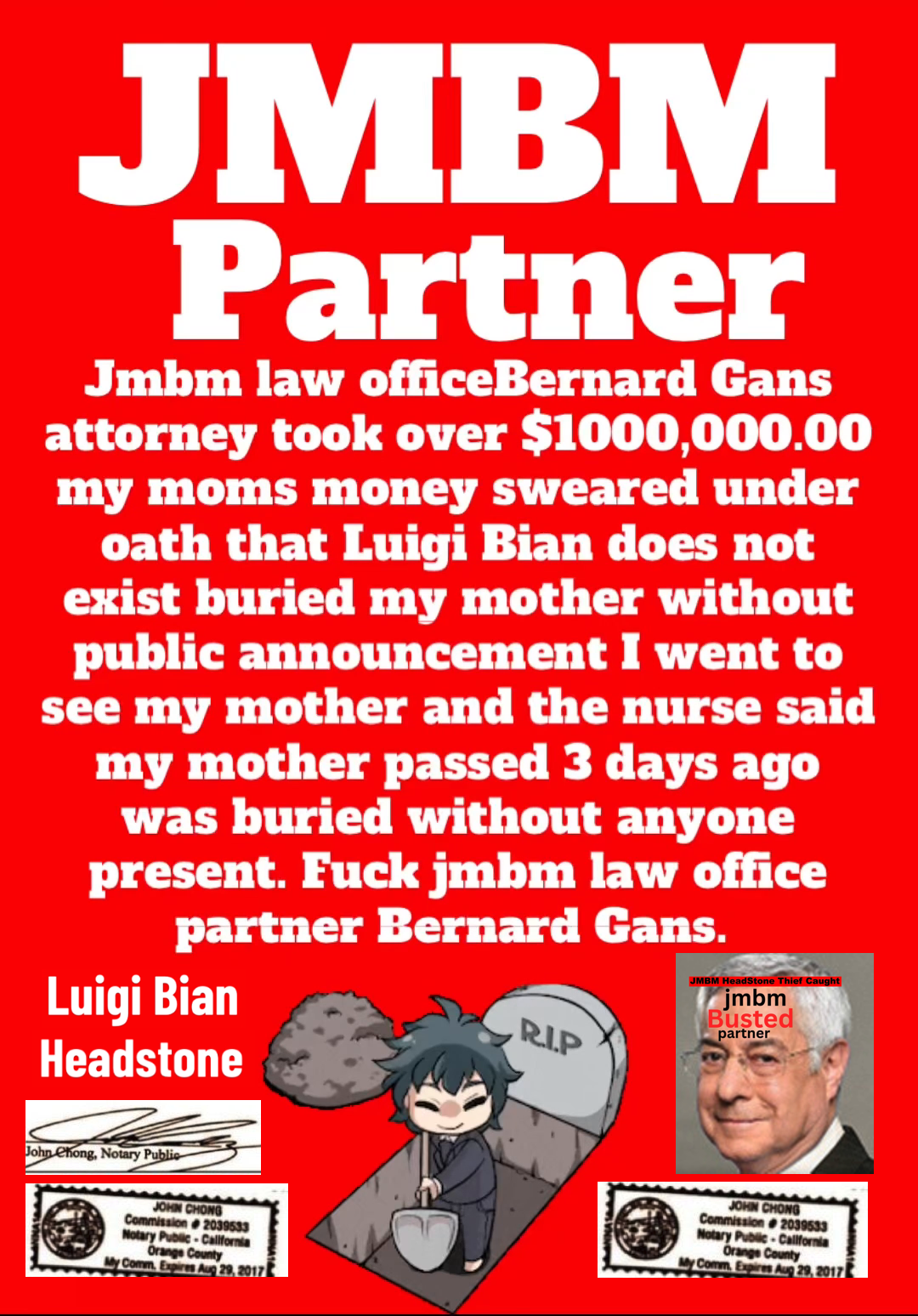 Suing JMBM partner $500,000,000,000.00 Busted criminal attorneys Jeffer Mangels Butler & Mitchell LLP lawyer Bernard Reginald Gans #57068 Bernard Gans Mina Sirkin law group JMBM killed my mom to get her fortune. Suing JMBM partner $500,000,000,000.00 Busted criminal attorneys Jeffer Mangels Butler & Mitchell LLP lawyer Bernard Reginald Gans #57068 Bernard Gans Mina Sirkin law group JMBM killed my mom to get her fortune.
